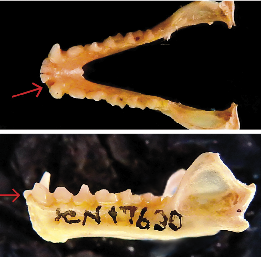 The dental anomaly is reported from the specimen ICN 17630 which has a missing lateral incisor (I2) in the mandible, without alveoli, resulting in a total of 3 lower incisors in each side of the mandible– one fewer than normal (Figures 1 and 2). This specimen is an adult male, exhibiting cranial sutures with advanced degree of ossification and little wear on the tooth cusps. Its morphometric measurements (in mm) are as follows: AB = 63.95, TL = 94, E = 22, FL = 16, GLS = 31.3, CIL = 28.2, CCL = 26.3, ZB = 16.6, PB = 6.9, PL = 13.9, and DENL = 19.9. This individual was collected by M. E. Rodriguez, P. A. Otalora, A. Camargo on July 09, 2001, in Ocamonte, Santander, Colombia. The lack of a dental socket, combined with the number of incisors and minimal dental wear, leads us to conclude that the anomaly is hypodontia, instead of the loss by a traumatic event.