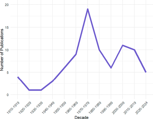 From our survey, we found 85 publications (Figure 2) reporting dental anomalies in bats along 114 years. The number of publications vary across different decades, though it is apparent that research in this area has been relatively sparse, with a rate of 0.73 publications per year. Each decade shows values ranging between 5 to 18 of publications, highlighting a significant underrepresentation in the scientific literature. Although there was a slight increase in the 1980s, this trend has not been sustained. In fact, the number of publications has been declining steadily since the 1990s (Figure 2). Our regression analysis confirms that statement. The p-value indicates that the year is not a statistically significant predictor of the number of publications (P > 0.05) showing no increase in the number of publications over consecutive decades.