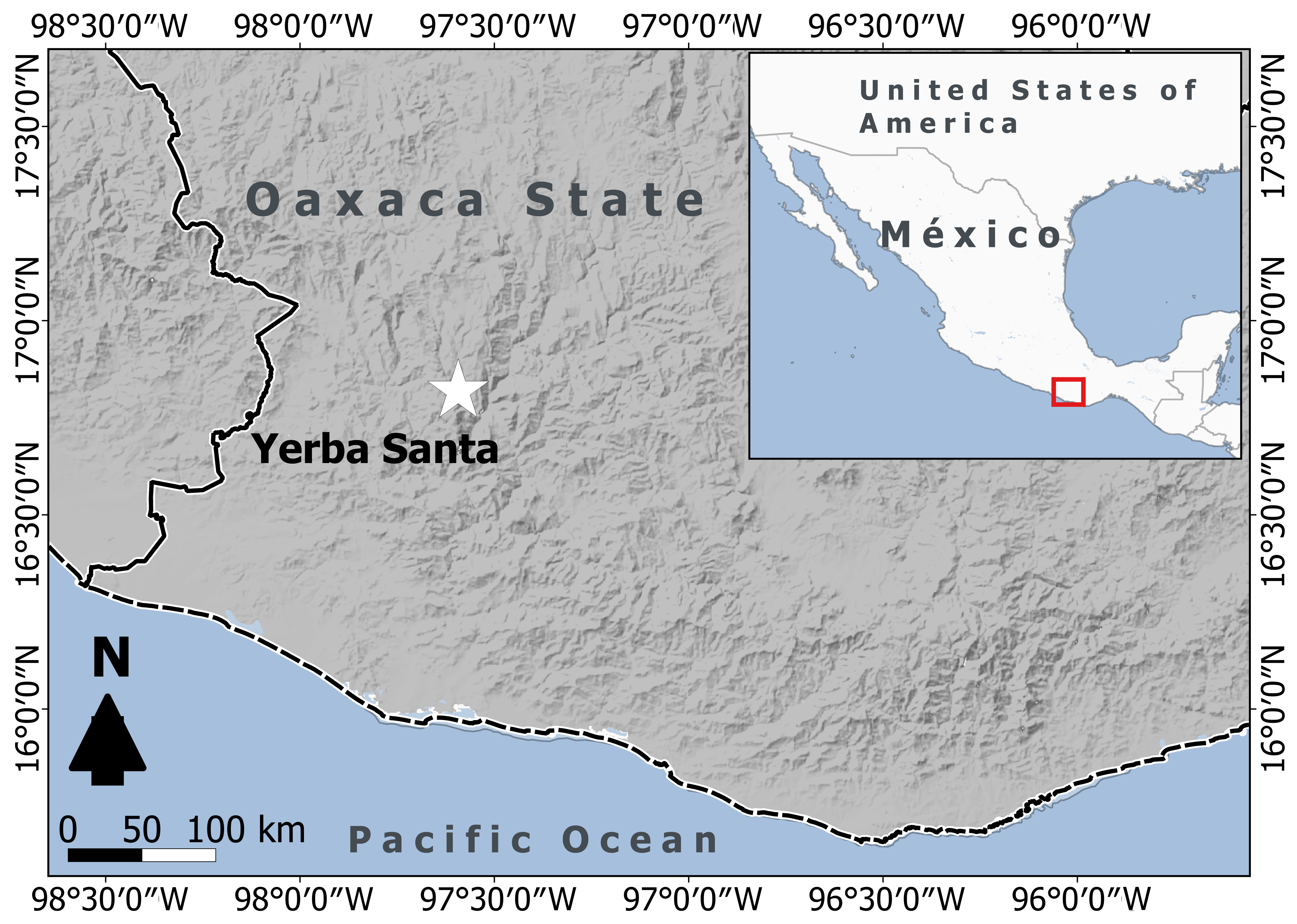 Figure 1. Geographical location of Yerba Santa, Municipality of Yosondúa, in the Mixteca region, State of Oaxaca, México.