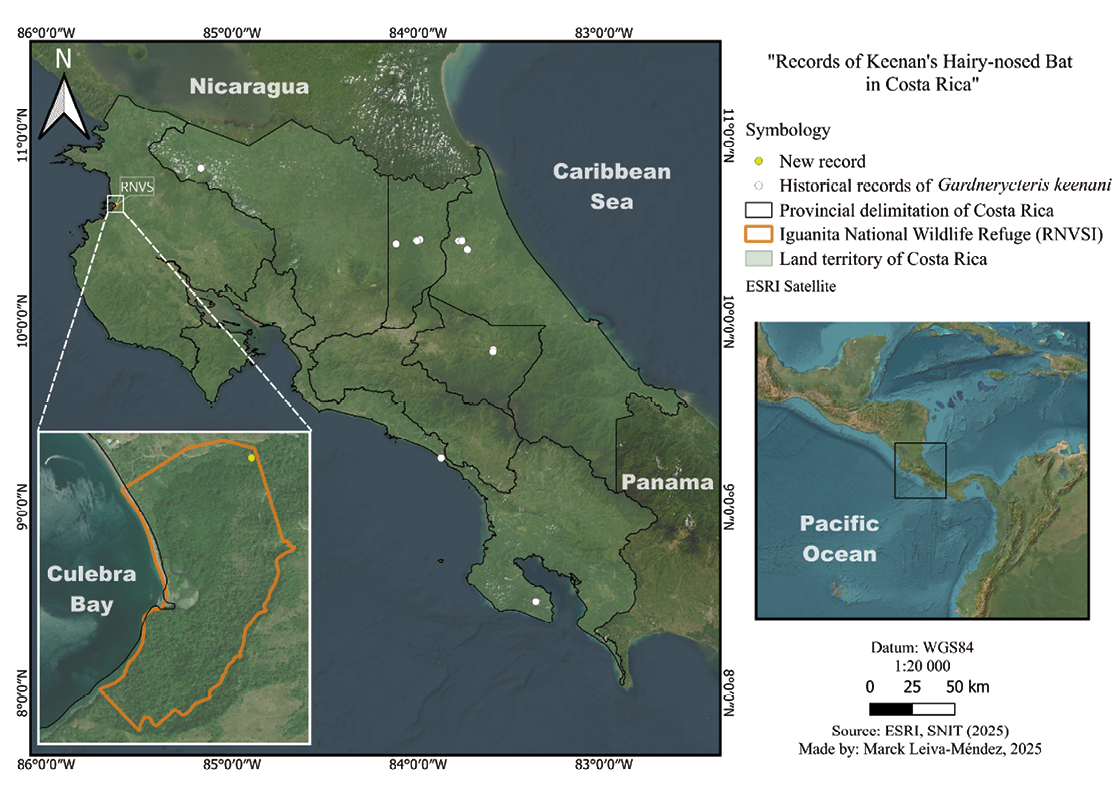 The National Ecological Monitoring Program (PRONAMEC) of the National System of Conservation Areas (SINAC) in Costa Rica aims to generate scientific information for biodiversity management in Protected Wildlife Areas. In 2023, the first structured bat survey was conducted in 4 protected areas of the Tempisque Conservation Area (ACT), recording Gardnerycteris keenani for the first time in the North Pacific of Costa Rica and the southernmost record of Artibeus inopinatus. Between July and October 2023, 6 mist nets were set up in the Iguanita National Wildlife Refuge (RNVSI), Guanacaste. The nets were placed at two sites: “Sendero Manglar” and “Quebrada Grande”, covering mangroves and deciduous dry forests areas, accomplishing a survey effort of 101.6 net-hours. An adult male Gardnerycteris keenani was recorded on July 14 and an adult female Artibeus inopinatus on October 16, both in good health. The finding of Gardnerycteris keenani extends its known distribution in Costa Rica, while the discovery of Artibeus inopinatus reinforces its association with tropical dry forests. These records highlight the ecological importance of the RNVSI and reveal information gaps due to limited previous sampling efforts. The presence of these species underscores the need to continue monitoring programs to support management decisions, especially in the face of anthropogenic threats.