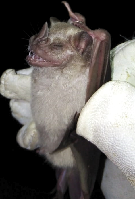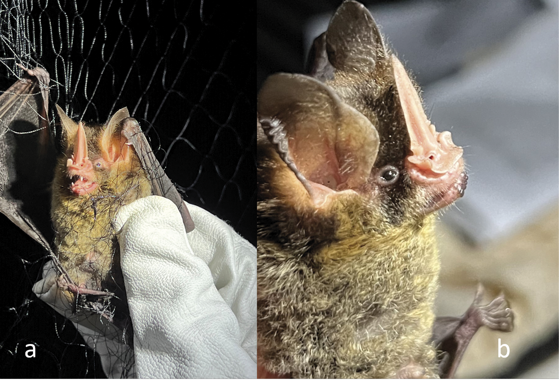 On July 14, an adult male G. keenani (Figure 2), with scrotal testes and a forearm length of 52 mm, was recorded. The individual appeared healthy and was released after examination. On October 16, an adult non-reproductive female A. inopinatus (Figure 3), with a forearm length of 48 mm, was recorded. The bat also appeared healthy and was released after examination.