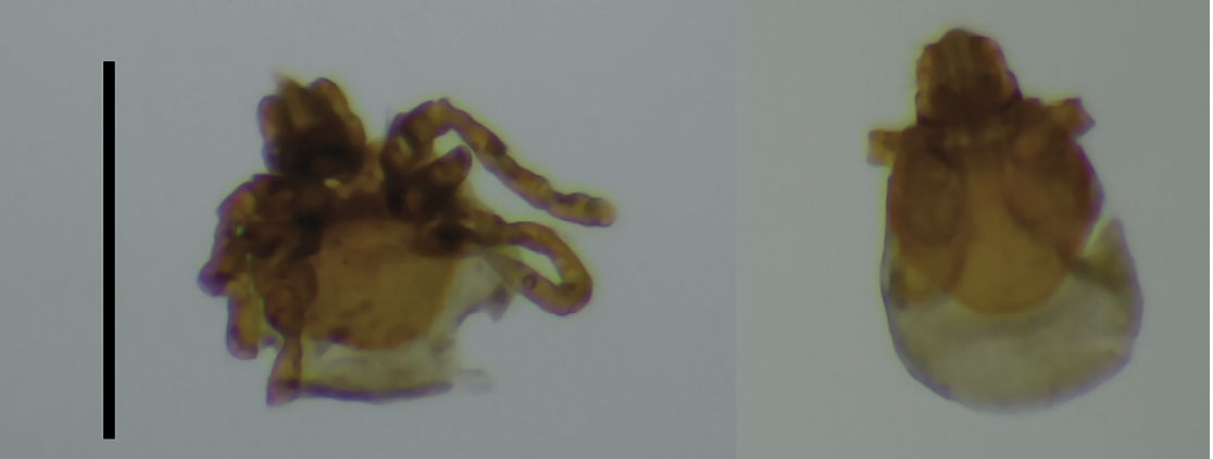 Figure 1. Ventral and dorsal views of Ixodes keiransi larvae specimens (A, B) collected from the intestinal contents of Peromyscus yucatanicus in Yucatan, Mexico. The scale is 600 microns.