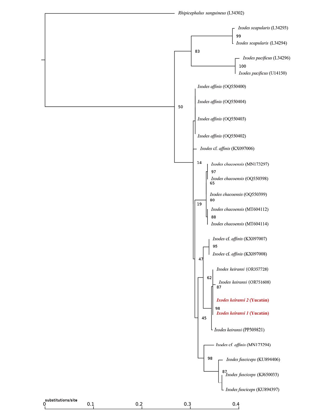 Ixodidae includes the Ixodes genus, which includes approximately 266 species (Guglielmone et al. 2023). Many of these are recognized as biological vectors of zoonotic pathogens responsible for several emerging or re-emerging diseases significant to public or animal health (Dantas-Torres et al. 2012; Madison-Antenucci et al. 2020; Aguilar-Tipacamú et al. 2025). Ixodes keiransi is a member of the complex Ixodes affinis, previously referred to as I. cf. affinis, I. near affinis or I. affinis (only in Mexico) (Nava et al. 2023; Rodríguez-Vivas et al. 2023). This tick species occurs in tropical and subtropical regions from Belize, Mexico, and southeastern USA. It has been found specifically in Mexico across Campeche, Chiapas, Hidalgo, Quintana Roo, Veracruz, and Yucatan. It is an ectoparasite that affects many animal hosts, including wildlife, farm animals like cattle and horses, and pets such as dogs and cats (Rodríguez-Vivas et al. 2023, 2024). Adult ticks are primarily associated with members of the Cetartiodactyla and Carnivora, such as cervids and carnivores, while larvae and nymphs tend to infest birds, reptiles, as well as small and medium-sized mammals (Martínez-Ortiz et al. 2019; Flores et al. 2020; Rodríguez-Vivas et al. 2024), including members of the Rodentia (Clark 2004; Harrison et al. 2010; Rodríguez-Vivas et al. 2023).
