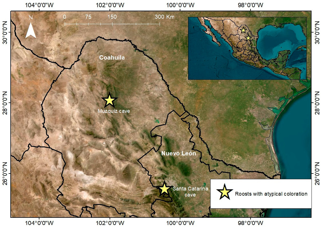 In bats, chromatic anomalies are reported globally (Lucati and López-Baucells 2017), and recent studies in Mexico have focused on examples of hypopigmentation such as albinism and piebaldism (Aguilar-López et al. 2021; Hernández-Aguilar et al. 2025). However, as visually shown in Lucati and López-Baucells (2017), the records of these anomalous colorations are geographically biased, with many regions remaining underrepresented or lacking any data altogether, such as Northern Mexico (Lucati and López-Baucells 2017). For instance, Northern Mexico is a notable region for research on bats, as karst formations are abundant, which provide crucial subterranean habitats such as caves (Elliot et al. 2023). Despite the ecological, cultural, and economic importance of cave-dwelling bats in Northern Mexico, bat surveys are limited, and more research effort is needed (Rivera-Villanueva et al. 2025).