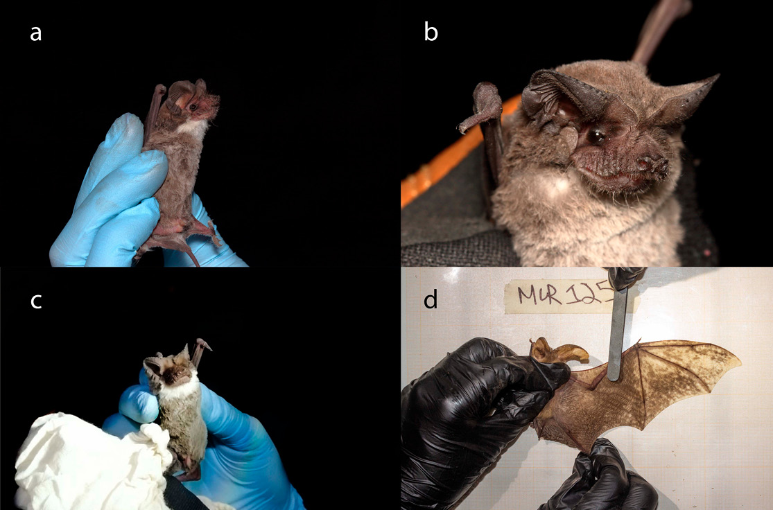 Figure 2. The captured bats with atypical colouration; a-c Tadarida brasiliensis exhibiting atypical colouration; d Piebald post-lactating female Corynorhinus townsendii.