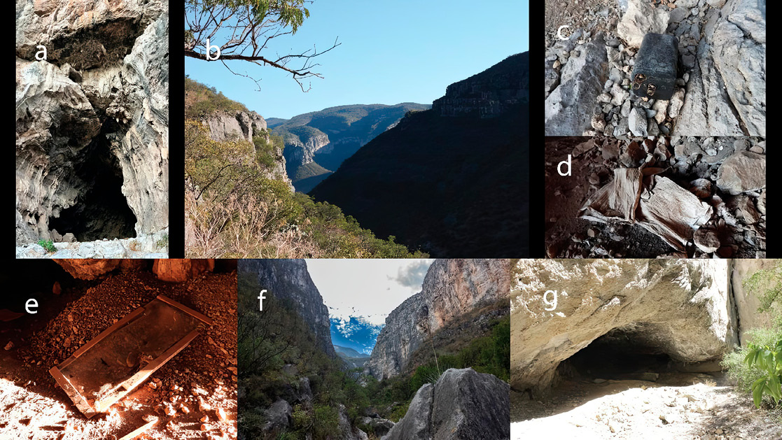 Figure 3. The Study sites and their surrounding habitats, a Muzquiz cave entrance; b Muzquiz cave surrounding habitat; c-d Abandoned waste at the cave; e Guano filtering equipment left by harvesters; f Santa Catarina surrounding habitat; g Santa Catarina cave entrance.