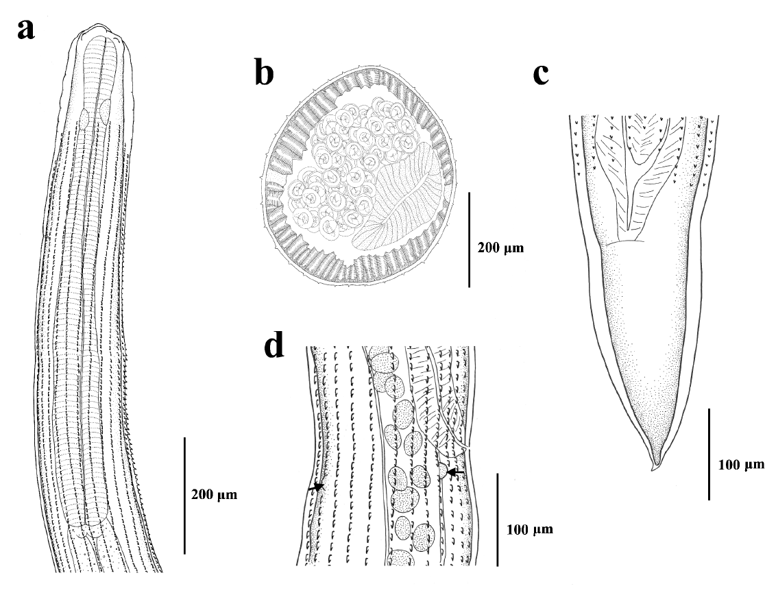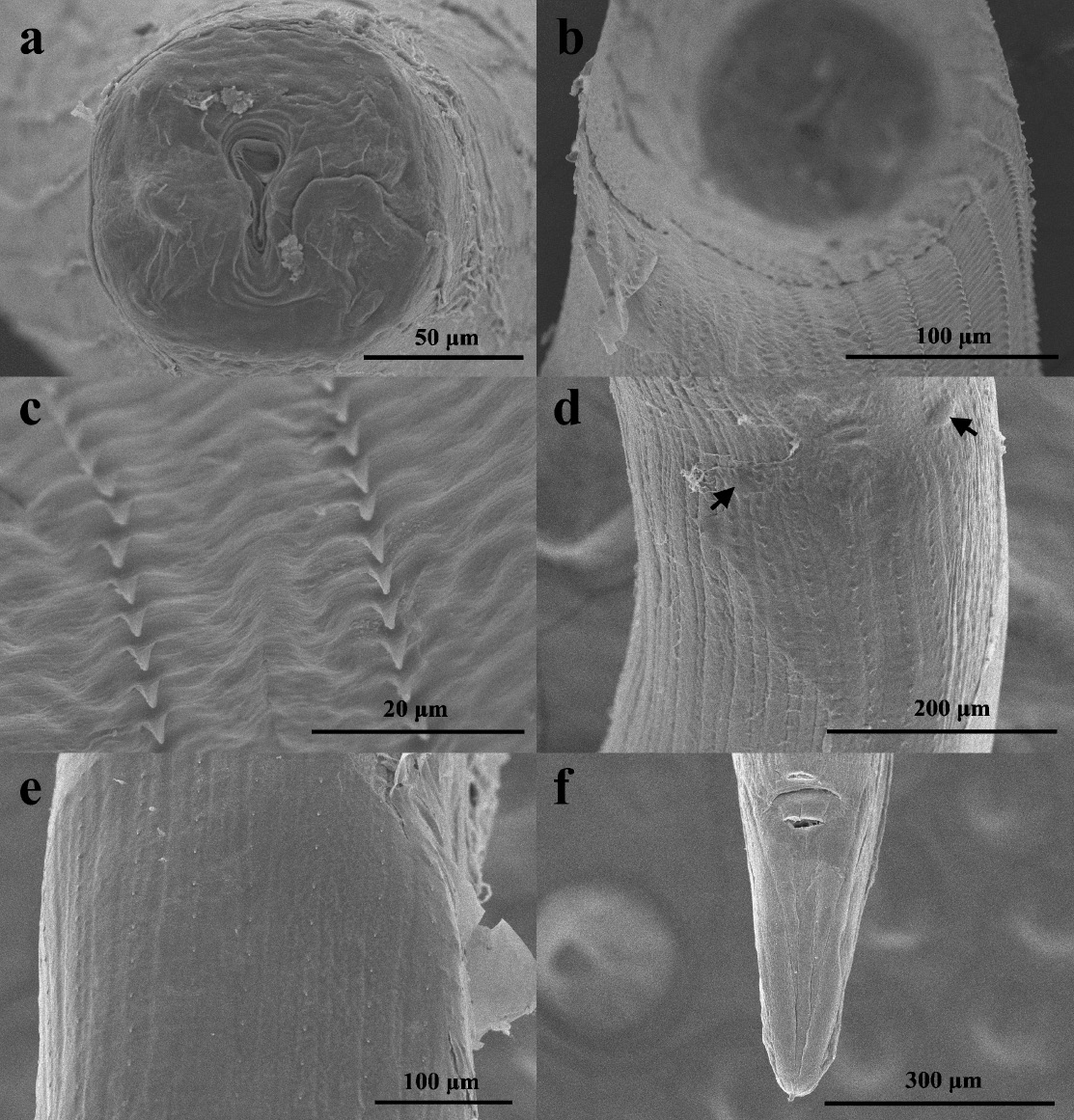 Two gravid specimens (1 adult female and 1 juvenile female) were studied morphologically. Below we present a brief description of the specimens. Triangular oral opening, surrounded by 4 double papillae (Figure 1a). Vestibule and denticles not observed. Esophagus rounded and swollen anteriorly (Figure 2a). Body with 32 rows of cuticular spines (Figure 2b) extending from slightly posterior to nerve ring throughout the mid-body (Figure 2a) and disappearing anterior to anus (Figure. 2c). Spines oriented posteriorly, longer in the anterior region, while in the middle and posterior parts, decreasing in size and the distance between them increases (Figure 1b-e). The main measurements of the adult female are presented in micrometers, followed by those of the juvenile female. Body 26,975 and 11,750 long, and 500 and 230 wide (at vulva level). Esophagus 1,430 and 890 long, and 120 and 68 wide at anterior end. Nerve ring situated 350 and 125 from anterior end. Deirids not observed. Vulva 10,750 and 5660 from anterior end, surrounded by two pairs of papillae located laterodorsally and lateroventrally (Figures 1d, 2d). Anus 570 and 250 from posterior end with short terminal spike 25 and 10 long (Figures 1f, 2c). Eggs with juvenile stage, 38‒40 long by 35‒38 wide, only observed in the adult female.