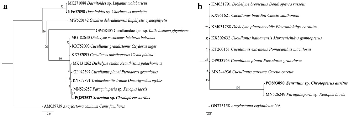 The 28S sequence generated from Seuratum sp. was 1,164 pb in length (PQ893537). After trimming to the D2-D3 expansion domains, the final alignment was 896 pb long. The 28S sequence of Seuratum sp. was aligned with other 11 sequences of nematodes belonging to the superfamily Seurotoidea. In the resulting phylogenetic tree, Seuratum sp. was positioned as a sister taxon to Paraquimperia sp. (Quimperiidae), isolated from the frog Xenopus laevis, though with low bootstrap support (57) (Figure 3a). The newly generated 28S sequence of Seuratum sp. showed a 19 % genetic difference from that of Paraquimperia sp. Unfortunately, the lack of representativeness of 28S gene sequences has limited the ability to achieve a more comprehensive phylogenetic relationships among the family Seuratidae.