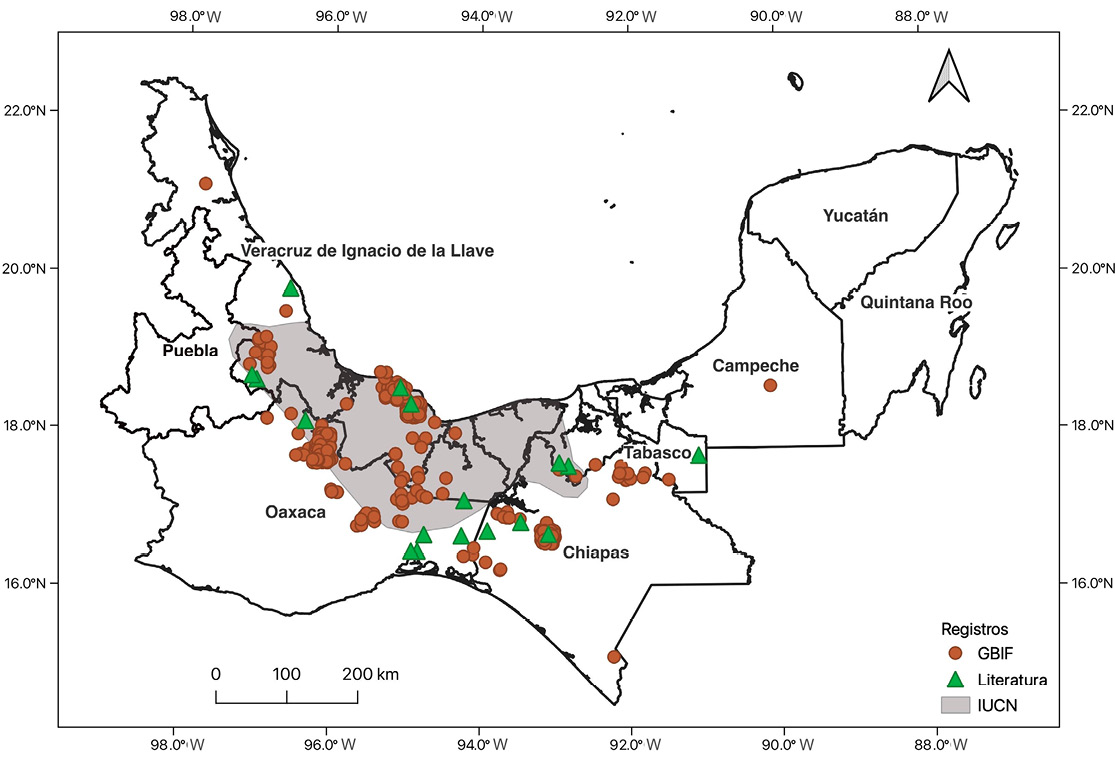Both GBIF data and scientific literature revealed records outside the species’ distribution range as defined by the IUCN, specifically in northern Chiapas near the municipality of Palenque, within the Selva El Ocote Biosphere Reserve, and in the southern region of Oaxaca. An additional record from the state of Campeche was documented, although it is likely the result of a misidentification.