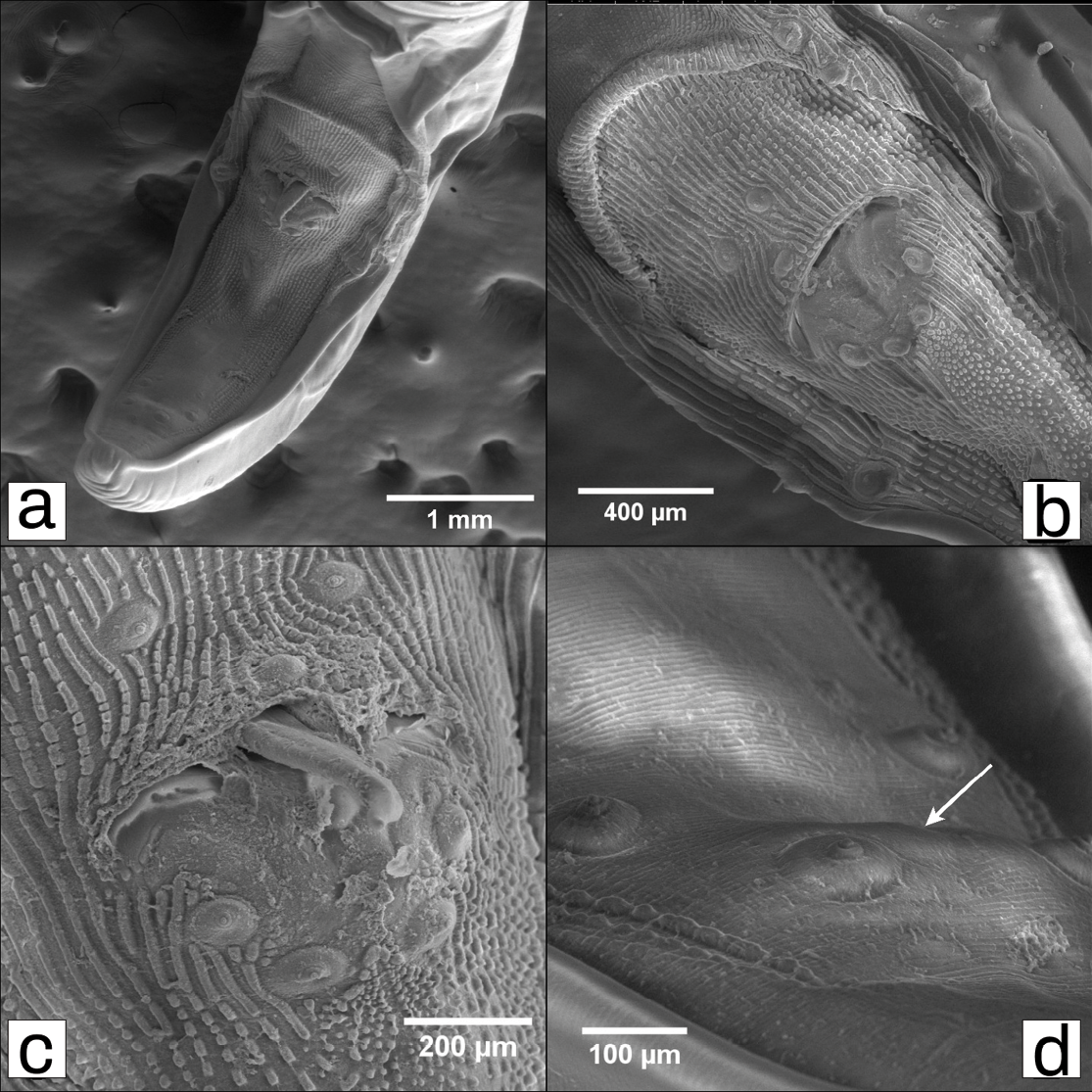 The nematodes found in the stomach of C. minimus were identified as Turgida turgida and correspond to males (n = 5) and one female (n = 1), with a mean length of 2.45 cm (2.90; 3.18; 2.42; 1.85; 1.88 cm) and 4.59 cm, respectively (Figure 1). No other parasites were found in the specimen. SEM revealed structures that differentiate T. turgida from other Physalopteridae species, such as ventrocaudal ornamentation patterns (Figure 2a, Figure 2b, Figure 2c), and the presence of the 22nd broad, truncated caudal papilla on the male tail (Figure 2d). The specimen examined had no apparent lesions on the stomach.