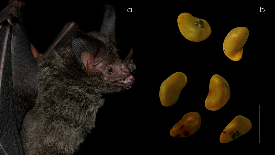 Figure 2. Lateral view of an adult male of Trachops coffini (a), and Ficus maxima seeds collected from the feces of the same individual (b). Scale bar = 3 mm.