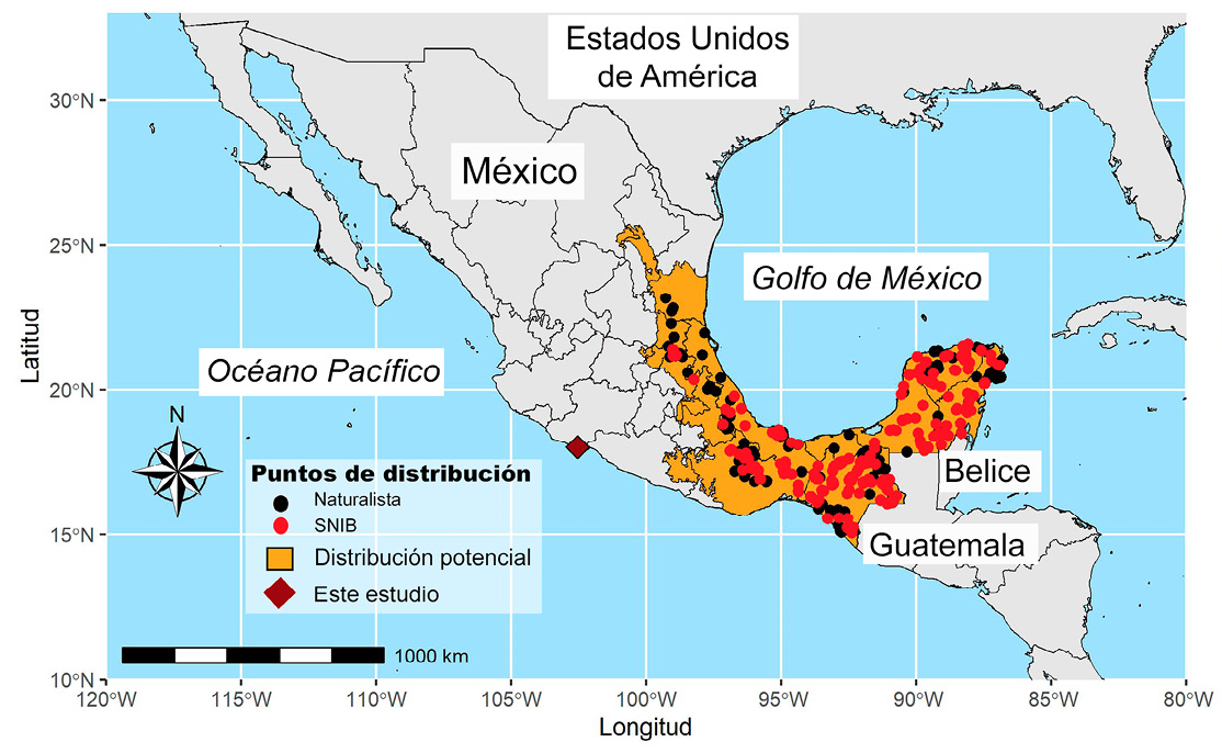 En años recientes distintos estudios han permitido alcanzar un mayor grado de conocimiento de la distribución de Cuniculus paca en México. Por ejemplo, Botello et al. (2005) documentaron la presencia de C. paca en el norte del estado de Oaxaca, a 60 km al oeste del límite que se suponía tenía su distribución. A su vez, Jiménez-Maldonado y López González (2011) reportaron por primera vez la presencia de C. paca en el estado de Querétaro, lo que a su vez desplazó cerca de 34 km el límite de su distribución conocida. Rodríguez-Ruíz et al. (2012) confirmaron la presencia de la especie en los estados de Hidalgo y Tamaulipas, lo que permitió alcanzar una mejor definición de su límite de distribución norteño. Por su parte, el estudio de Ramírez-Bravo y Hernández-Santín (2012) reveló que C. paca se distribuía ampliamente en el norte de Puebla. Más adelante, Padilla-Gómez et al. (2019) registraron a la especie en un área de Oaxaca en donde no se había reportado previamente pero que formaba parte del área de su distribución predicha por modelos de nicho ecológico. Dentro de este contexto el registro de C. cuniculus que reportamos resulta insólito porque se aleja cerca de 500 km de los registros más cercanos en el estado de Oaxaca, contenidos en las bases de datos del Sistema Nacional de Información sobre Biodiversidad (SNIB) de la Comisión Nacional para el Conocimiento y Uso de la Biodiversidad (CONABIO) y de iNaturalisMx (https://enciclovida.mx/ especies/34488-cuniculus-paca) (Figura 1).