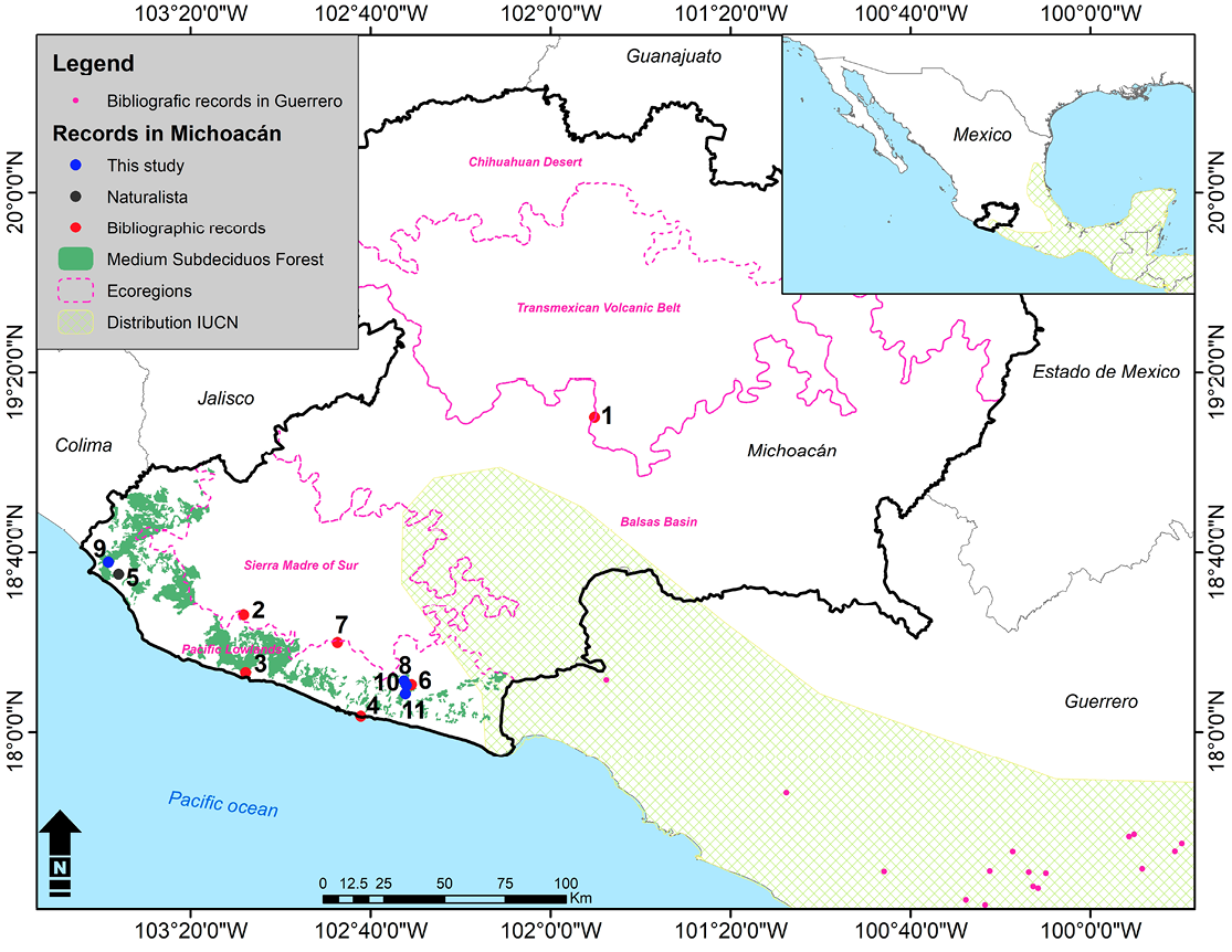 The oldest historic record corresponds to a male specimen collected from the Balsas Basin in the Municipality of Nuevo Urecho housed in the Natural History Museum in London, England, collected by H.H. Smith in 1889; catalog number NHM: 19457 (Arroyo-Cabrales 2010). The coordinates of the record constitute the most interior locality in the state (Record No.1, Figure 1). No other kinkajou record is available from the Balsas region.