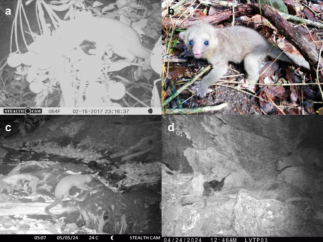 Figure 2. New records of kinkajou (Potos flavus) in Michoacán, Mexico. IDs correspond to locality numbers in table 1. a) Feeding on a black sapote tree (Diospyros digyna) (ID 8), b) Juvenile (ID 9), c) Drinking from a spring (ID 10), d) Drinking from a spring (ID 11).
