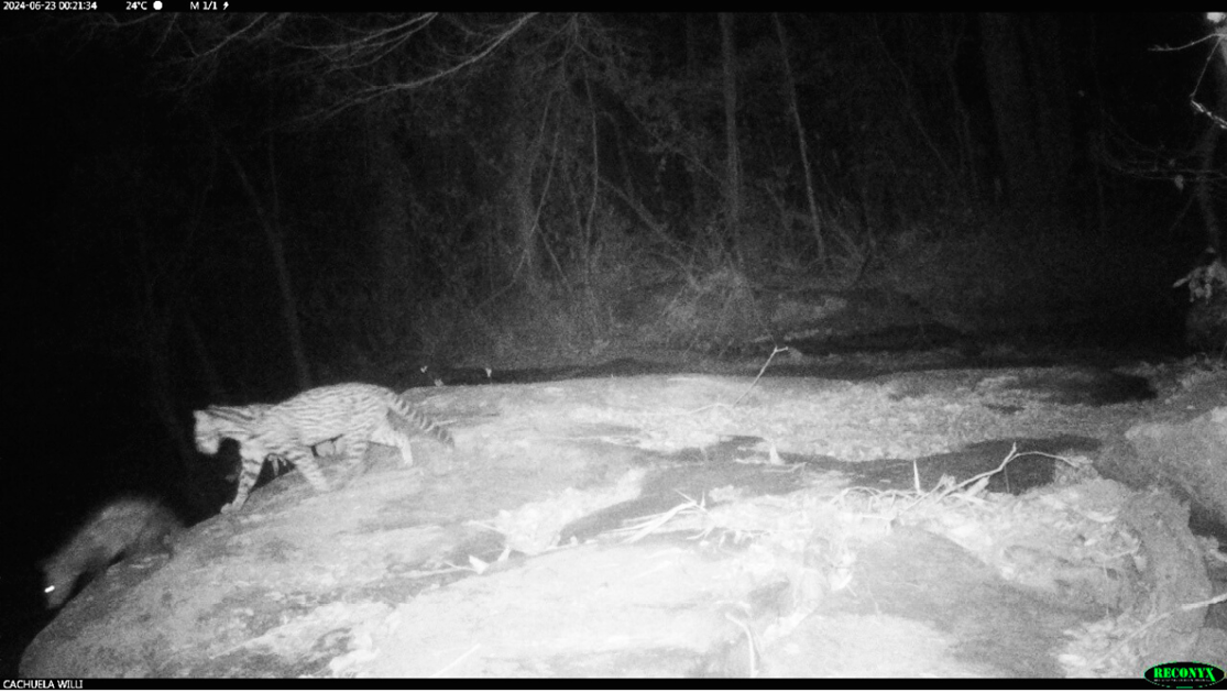 Across the entire sampling period, the cameras recorded 471 independent detections of ocelots (1000 images) and 232 of common opossum (561 images). On 23rd June 2024, at 00:21:34 hr, during the waxing gibbous lunar phase, a camera trap (model: Reconyx XR6 UltraFire; coordinates: 16°22’48” S, 62°02’07” W) captured the unusual event of an ocelot and a common opossum walking one after the other (Figure 2). Although slightly blurred, the opossum is identified as D. marsupialis based on diagnostic features, including the body shape, the coloration of its limbs and ears, which distinguish it from the similar-looking D. albiventris (Rocha and Rumiz 2019). This station is located at a rocky cascade that forms small natural pools, frequently used by wildlife as water sources, resting areas, or shelter, which may have contributed to the likelihood of such an encounter. A visual screening of the entire camera-trap dataset did not reveal any additional records of simultaneous co-ocurrence between the species, indicating that this event represents a rare observation within the study period.