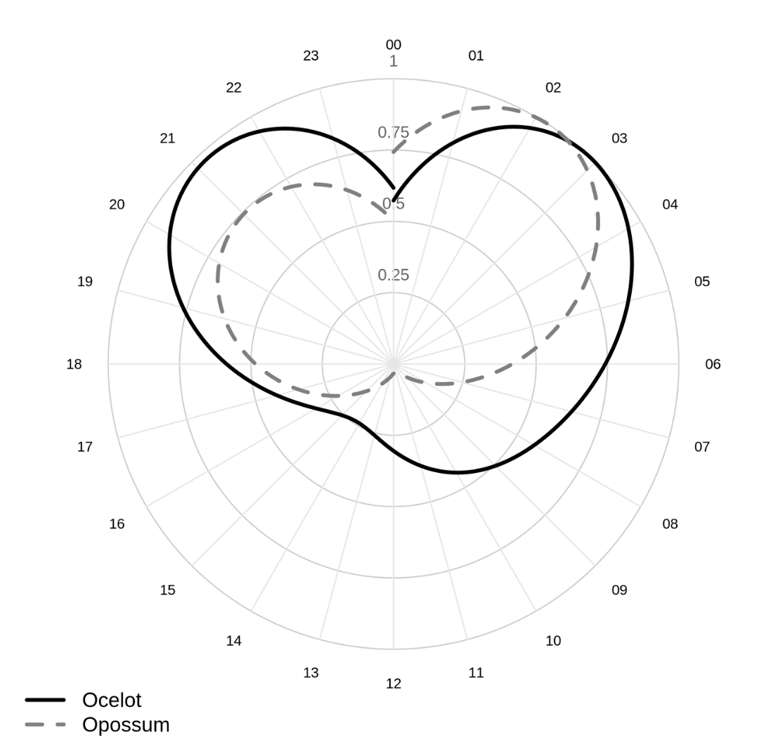Figure 3. Circular kernel density estimates of daily activity patterns for ocelots (solid black line) and common opossums (dashed grey line) based on camera trap detections. Angles represent time day (00-23 h), and radial distance indicate relative activity intensity.