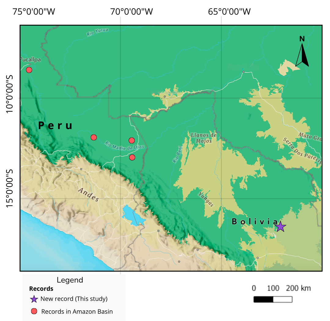 The observation was made in the Chiquitano dry forest, an endangered ecoregion located in eastern Bolivia’s Precambrian Shield, representing a transitional zone between moist and dry forest ecosystems (Jansen et al. 2020). Situated at an altitude of approximately 500 m above sea level, the region experiences a mean daily temperature of ~24.4 °C and an annual precipitation of approximately 1,200 mm (Killen et al. 2006).