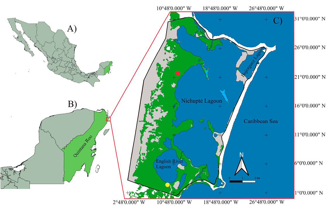 The records were obtained from the Nichupté Mangrove Protected Natural Area, which is located in the northeastern part of Quintana Roo, Mexico (Figure 1). This area has a surface area of 4,257 ha, dedicated to the protection and preservation of biodiversity with dominant mangrove vegetation of the species Avicennia germinans (black mangrove), Conocarpus erectus (buttonwood mangrove), Laguncularia racemosa (white mangrove), and Rhizophora mangle (red mangrove), and an elevation range of 0 to 4 meters above sea level (SEMARNAT 2014).
