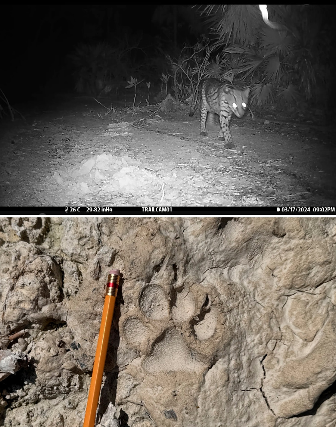 Figure 2. Record of L. pardalis in the Nichupté mangrove protected natural area. A) Photographic record using a camera trap. B) Record using tracks.